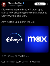 Disney and WB teaming up to offer a bundle of Disney+, Hulu, and Max Anonymous 05/08/24 (Wed) 22:47:46 No.13[Reply]